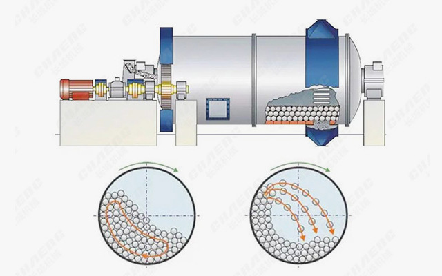 物料由進(jìn)料裝置經(jīng)入料中空軸螺旋均勻地進(jìn)入球磨機(jī)第一倉(cāng),該倉(cāng)內(nèi)有階梯襯板或波紋襯板,內(nèi)裝不同規(guī)格鋼球,筒體轉(zhuǎn)動(dòng)產(chǎn)生離心力將鋼球帶到一定高度后落下,對(duì)物料產(chǎn)生重?fù)艉脱心プ饔?。物料在第一倉(cāng)達(dá)到粗磨后,經(jīng)單層隔倉(cāng)板進(jìn)入第二倉(cāng),該倉(cāng)內(nèi)鑲有平襯板,內(nèi)有鋼球,將物料進(jìn)一步研磨。粉狀物通過(guò)卸料箅板排出,完成粉磨作業(yè)。
