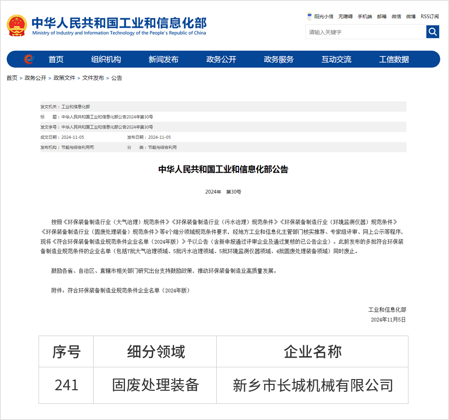 近日,中華人民共和國(guó)工業(yè)和信息化部發(fā)布符合環(huán)保裝備制造業(yè)規(guī)范條件企業(yè)名單(2024年版)。其中,固廢處理裝備類企業(yè),新增11家,復(fù)核通過47家。新鄉(xiāng)市長(zhǎng)城機(jī)械有限公司憑借固廢處理領(lǐng)域的創(chuàng)新技術(shù)和卓越表現(xiàn),繼2021年入選環(huán)保裝備制造業(yè)規(guī)范條件企業(yè)名單后,今年度再次順利通過復(fù)核。